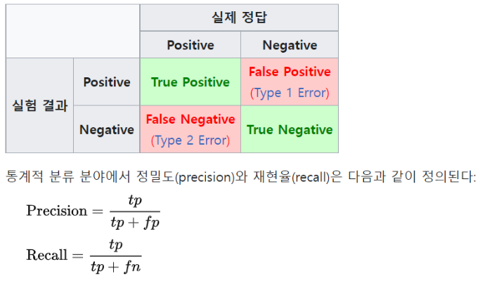 - 정확도 Precision : 모델이 참이라고 예측한 결과 중 실제로 참인 경우의 비율